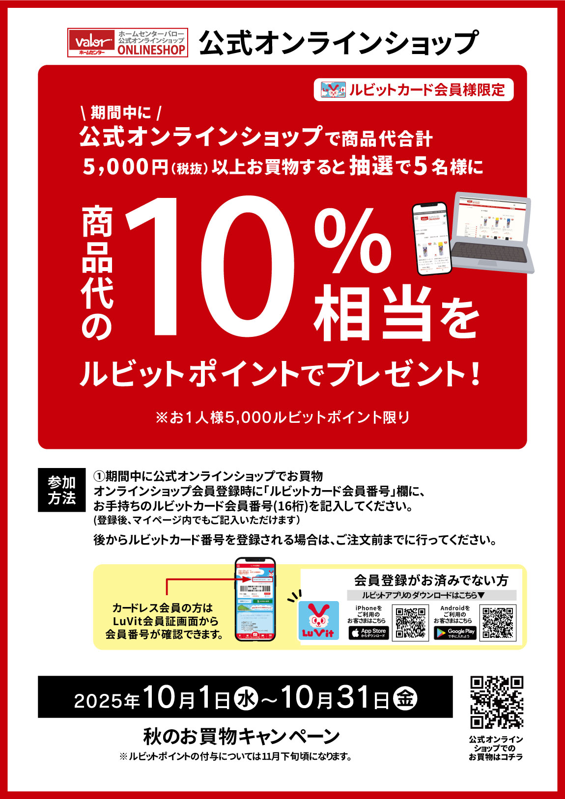 ・【秋のお買物キャンペーン】ポイント付与は、11月下旬にお手もとのルビットカードに付与されます。