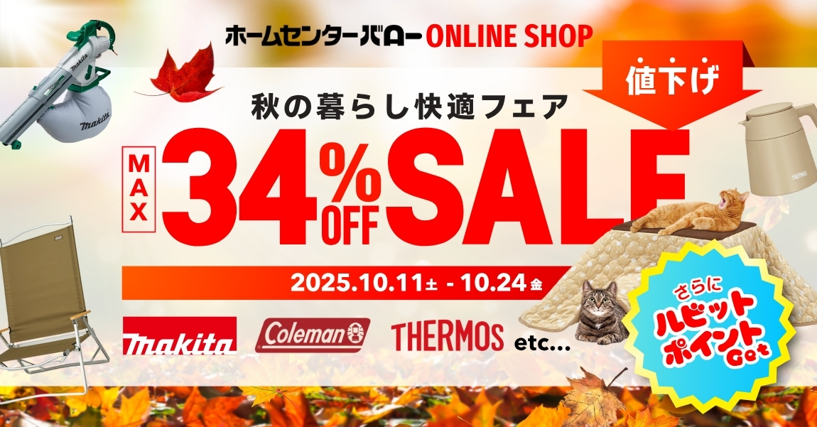 秋の暮らし快適フェア🍁秋の暮らし快適フェア|園芸・アウトドア・キッチンアイテムが最大34%OFF【10/24(金)まで】秋の暮らし快適フェア 2025年10月6日 Filed under: hcvalor_ec \ ただいま開催中のキャンペーンも是非ご利用ください! / PICK UP! 在庫限り特価! Coleman・LOGOS・尾上製作所が今だけお買い得ペットの温活応援セール! こたつ・保温電球が今だけお買い得人気キッチン用品が特価。 毎日の料理がもっと楽しく雑草・害獣・害虫の悩み解決! ガーデニング用品が今だけお買い得庭仕事がラクになる! 工進・マキタの園芸機械が特価セール 在庫限り特価!Coleman・LOGOS・尾上製作所が今だけお買い得 尾上製作所 イクシード バーベキューコンロ 650-HL EX-650V-HL 6~7人用 高さ3段階調節 串焼き BBQ 焼肉 アウトドア キャンプ EX-650V-HL通常価格9,878円[税込]通常価格より9%OFFSALE価格8,980円[税込]さらに408ルビットPt詳しくはこちら コールマン チェア フォールディングチェアワイド オリーブ 2000038846通常価格9,900円[税込]通常価格より29.%OFFSALE価格6,980円[税込]さらに317ルビットPt詳しくはこちら コールマン タープ XPヘキサタープMDX 2000028621通常価格23,980円[税込]通常価格より29.%OFFSALE価格16,800円[税込]さらに763ルビットPt詳しくはこちら ロゴス ポータブルガスストーブ シルバークイーン 81060035通常価格29,800円[税込]通常価格より33%OFFSALE価格19,800円[税込]さらに900ルビットPt詳しくはこちら ペットの温活応援セール!こたつ・保温電球が今だけお買い得 猫用こたつ 猫 ハウス 省エネ 遠赤外線 にゃんこの和みこたつ にゃごみ 猫 こたつ ネコ ねこ M 温活 CT-543 マルカン通常価格6,480円[税込]SALE価格6,300円[税込]さらに286ルビットPt詳しくはこちら マルカン 猫用こたつ 猫 ハウス 省エネ 遠赤外線 にゃんこの和みこたつ にゃごみ 猫 こたつ ネコ ねこ L CT-544温活通常価格9,500円[税込]通常価格より6%OFFSALE価格8,900円[税込]さらに404ルビットPt詳しくはこちら マルカン HD-40C 保温電球カバー付 40W 小動物 小鳥 爬虫類 保温 ヒーター 温活通常価格3,850円[税込]通常価格より11%OFFSALE価格3,400円[税込]さらに154ルビットPt詳しくはこちら マルカン 保温電球 カバー付 60W HD-60C ミニマルランド 小動物 小鳥 爬虫類 保温 ヒーター 温活通常価格4,290円[税込]通常価格より7%OFFSALE価格3,980円[税込]さらに180ルビットPt詳しくはこちら 人気キッチン用品が特価。毎日の料理がもっと楽しく サーモス(THERMOS) 真空断熱マグカップ カフェラテ JDZ-350通常価格3,278円[税込]通常価格より6%OFFSALE価格3,080円[税込]さらに140ルビットPt詳しくはこちら サーモス(THERMOS) 真空断熱コーヒーサーバー カフェラテ TTF-720通常価格4,378円[税込]通常価格より15%OFFSALE価格3,680円[税込]さらに167ルビットPt詳しくはこちら 貝印 スライサー おろし金 キッチンツール セット 関孫六 調理器セット(ガード付き) DH3333 母の日 プレゼント ギフト通常価格4,280円[税込]通常価格より18%OFFSALE価格3,480円[税込]さらに158ルビットPt詳しくはこちら 貝印 生クリーム ホイッパー 生クリッチ DK5150 | KAI NAMACRICH コンパクト 自動 泡立て クリーム コードレス 充電式 USB-C 充電ケーブル 付属 DK5150通常価格8,800円[税込]通常価格より26%OFFSALE価格6,480円[税込]さらに294ルビットPt詳しくはこちら 雑草・害獣・害虫の悩み解決!ガーデニング用品が今だけお買い得 【返品保証あり】ガーデンバリア ミニ 変動超音波式 ネコ被害軽減器 GDX-M型 ユタカメイク 猫避け 乾電池式 赤外線センサー ハクビシン通常価格7,280円[税込]通常価格より24%OFFSALE価格5,480円[税込]さらに249ルビットPt詳しくはこちら アポロ 電撃ブロッカー ソーラー DB-2021SR 害獣対策 防獣 家庭菜園 小規模 単品通常価格34,980円[税込]SALE価格34,980円[税込]さらに1590ルビットPt詳しくはこちら 三井化学クロップ&ライフソリューション スラゴ 2kg 殺虫剤 ナメクジ カタツムリ ガーデニング 安全 駆除剤 耐雨性 環境に優しい 2kg通常価格5,362円[税込]通常価格より26%OFFSALE価格3,960円[税込]さらに180ルビットPt詳しくはこちら 大成農材 サンフーロン液剤 2L 除草剤 スギナ ササ 竹 ジェネリック除草剤 安心 安全 田んぼ 畑 農林水産省登録品 2L通常価格3,980円[税込]通常価格より17%OFFSALE価格3,300円[税込]さらに150ルビットPt詳しくはこちら アース製薬 アースカマイラズ草消滅4.5L 園芸用品 除草剤SALE価格3,630円[税込]からさらにルビットPtお選びください 4.5L×1本 4.5L×2本 4.5L×4本 レインボー薬品 ネコソギトップW 粒状除草剤SALE価格4,780円[税込]からさらにルビットPtお選びください 3kg 5kg 10kg 住友化学園芸 オルトランDX 粒剤 殺虫剤 1kgx3袋 害虫 防除 花 野菜 浸透移行性通常価格4,296円[税込]通常価格より18%OFFSALE価格3,520円[税込]さらに160ルビットPt詳しくはこちら 住友化学園芸 ベニカXガード粒剤 550gx3袋 殺虫殺菌剤 粒状 花 野菜 うどんこ病 灰色カビ病通常価格4,983円[税込]通常価格より11%OFFSALE価格4,400円[税込]さらに200ルビットPt詳しくはこちら 住友化学園芸 ベニカナチュラルスプレー 1000mL 殺虫殺菌剤 ガーデニング 家庭菜園 天然由来SALE価格