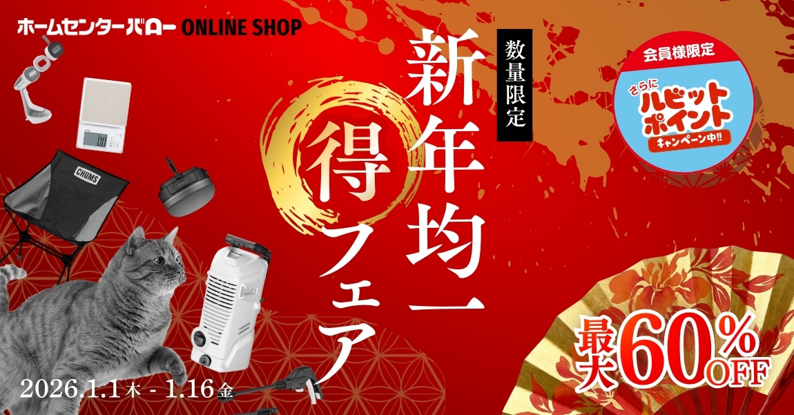 1/1~1/16限定「初売り均一おトク祭」開催!新年の買い替え・日用品補充に最適な人気商品を、2,000円・3,000円・5,000円・10,000円などの分かりやすい均一価格でご用意。ケルヒャー高圧洗浄機や生活家電、キッチン用品、ペット用品、アウトドアまでカテゴリ横断でまとめ買いがお得。最大60%OFF&ルビットポイント付与で実質価格もさらにお得。在庫限り・なくなり次第終了のため、初売りは早めのチェックがおすすめです。