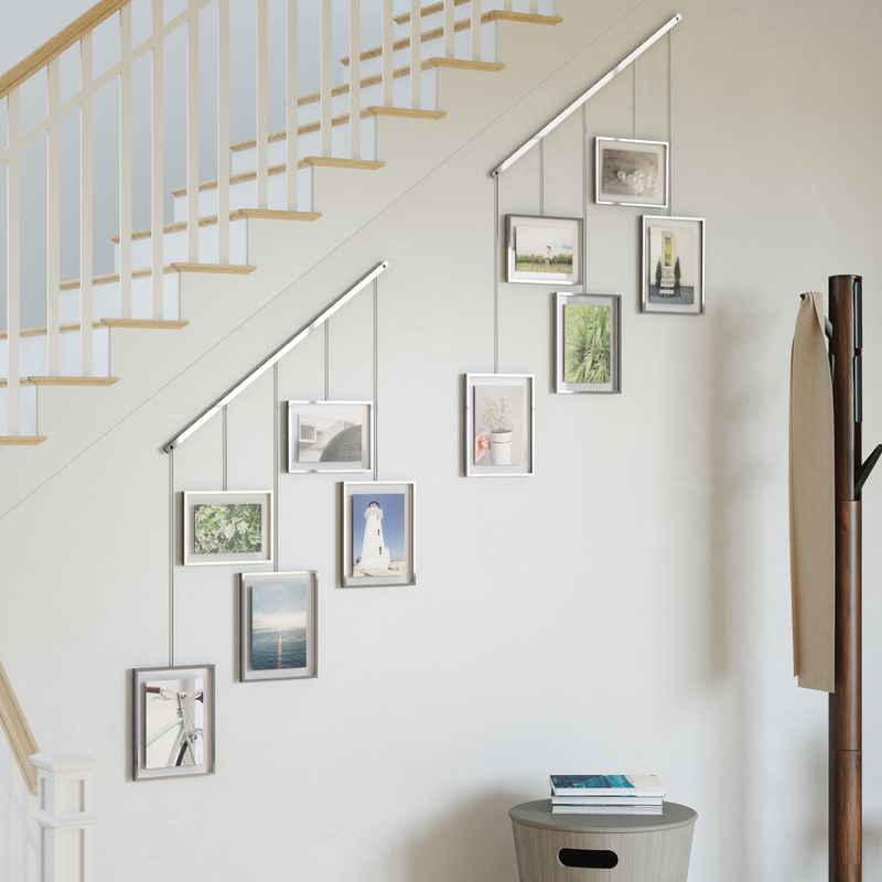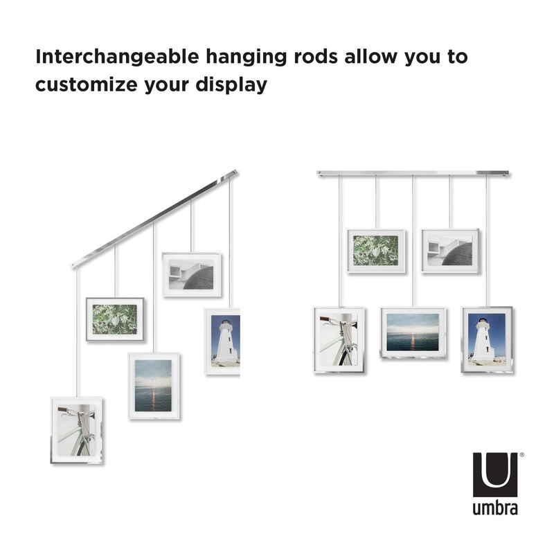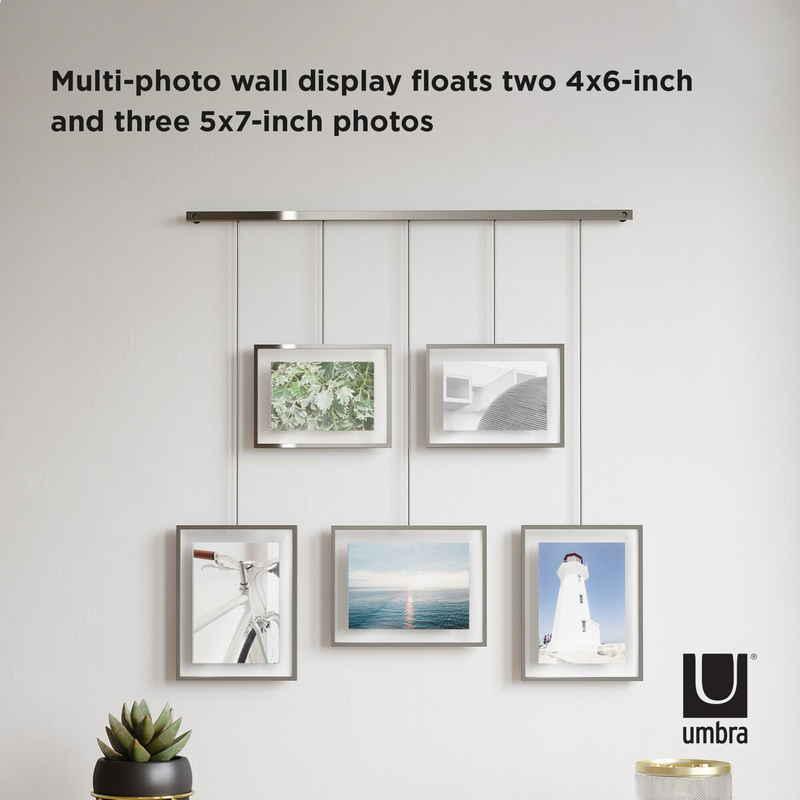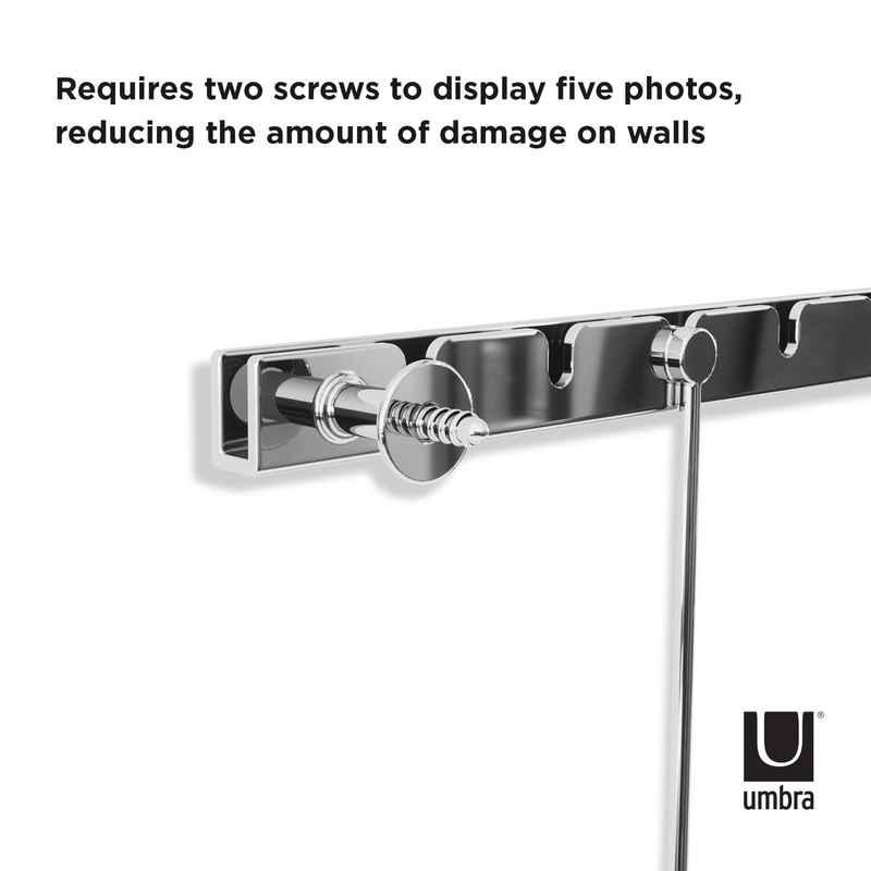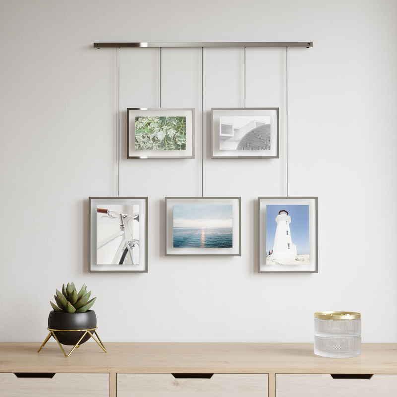 モダンで美しいレールから5個のフォトフレームを吊り下げた、ギャラリースタイルのフォトディスプレイです。