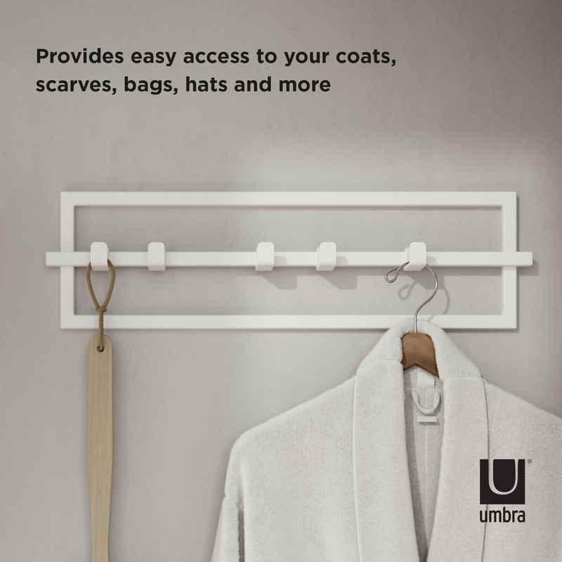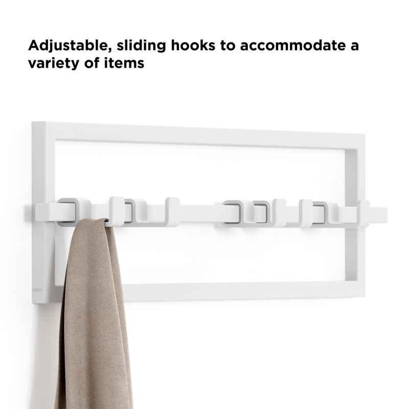 左右にスライド可能な壁掛けフック 限られたスペースを有効活用 掛ける物に合わせてスライドできる5連フック 衣類を掛けやすい設計 フックの耐荷重は約2.3kg