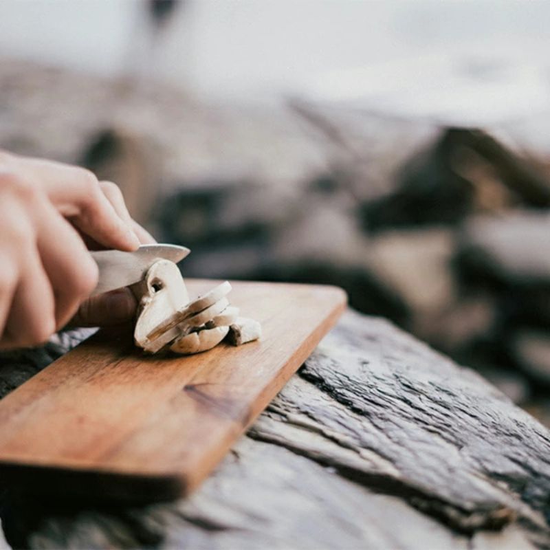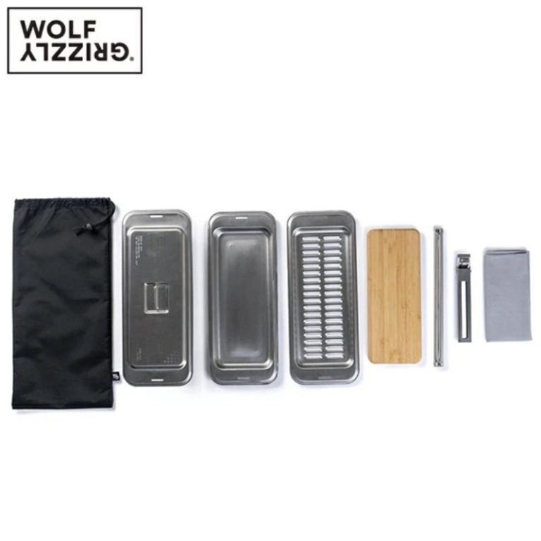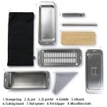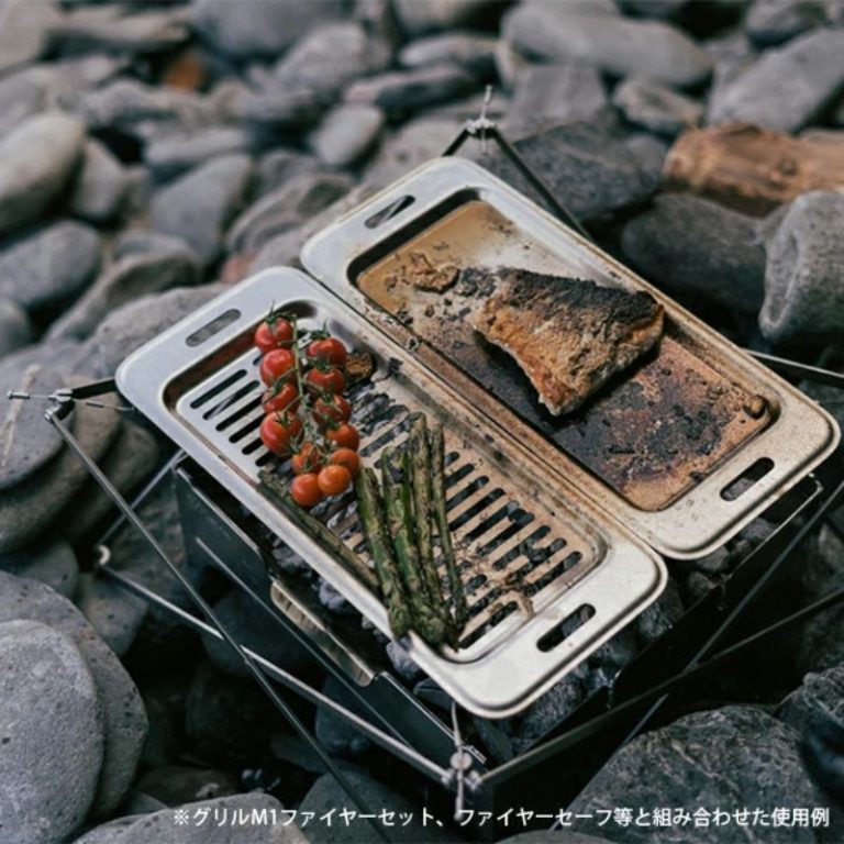 グリル M1 エディション with ファイヤーセットで使う事ができる皿、まな板、複数のグリル、汁用クッカーがセットになったクッキングキット。