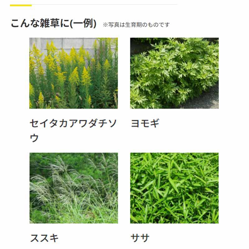 ・成分が土壌に一定期間とどまるので、新しい雑草の発生を予防が可能で、この効果は約5〜9か月間持続します(散布時期や使用量、雑草の種類等により差が生じます)