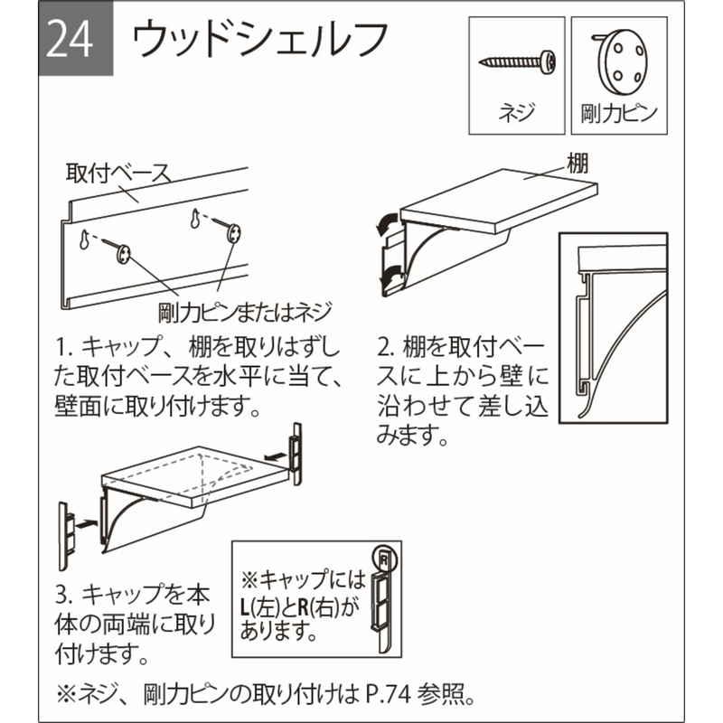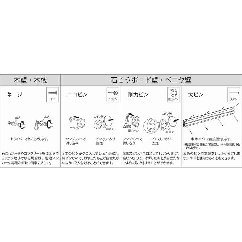 備考:・取り付け場所/石こうボード壁、ベニヤ壁、木壁、木桟 ・安全荷重/ピン3kg/ネジ5kg