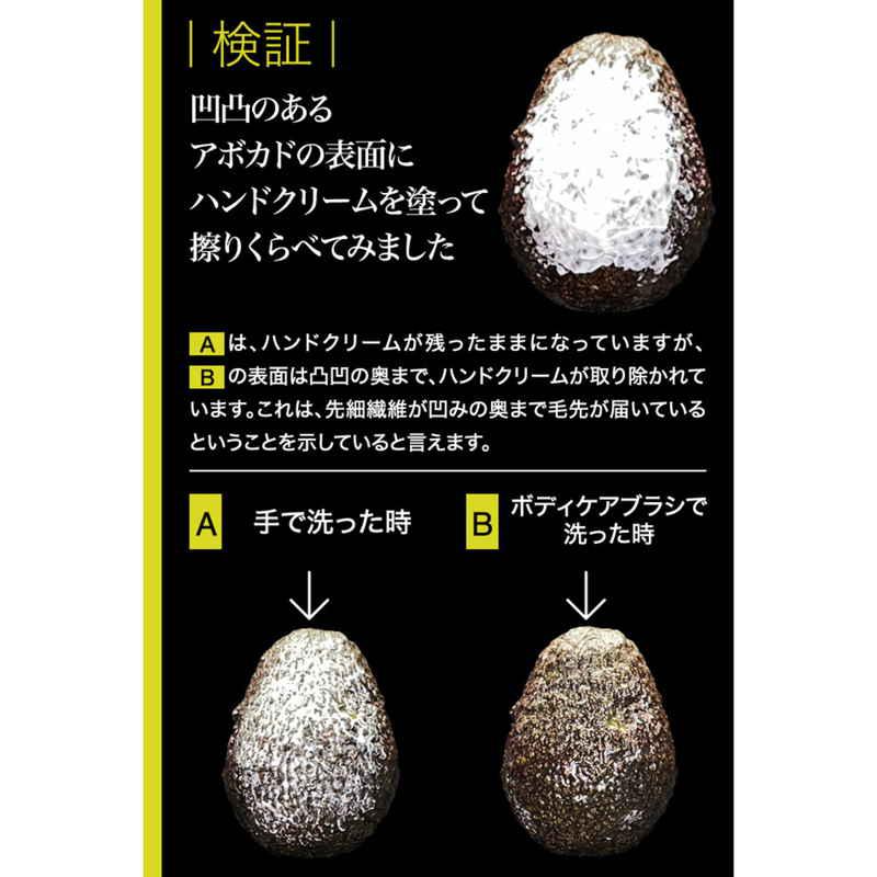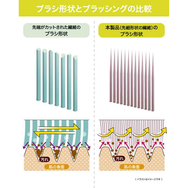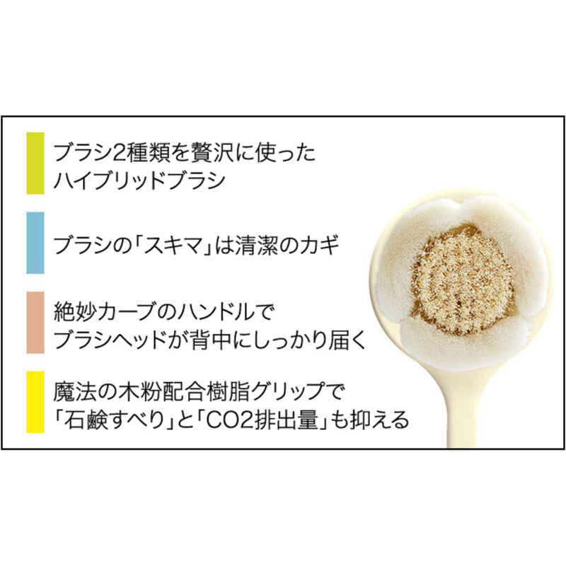ブラシのプロが本気で考えたボディケアブラシ 2種類の繊維を贅沢に使ったハイブリッドブラシ うっとり肌あたりの先細毛 もっちり泡の特殊断面繊維 木粉配合樹脂グリップで石鹸すべりを解消