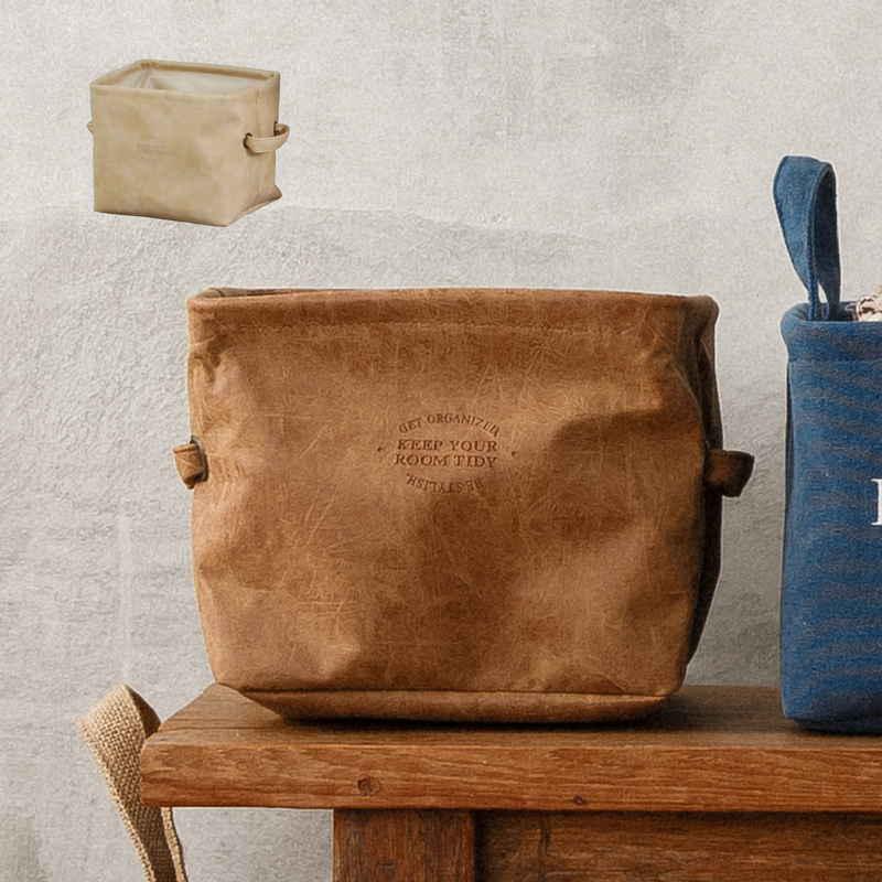 味わい深い落ち着いた色味とシックな雰囲気を醸し出す合皮製のストレージボックスです。