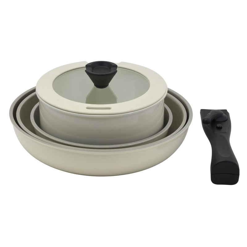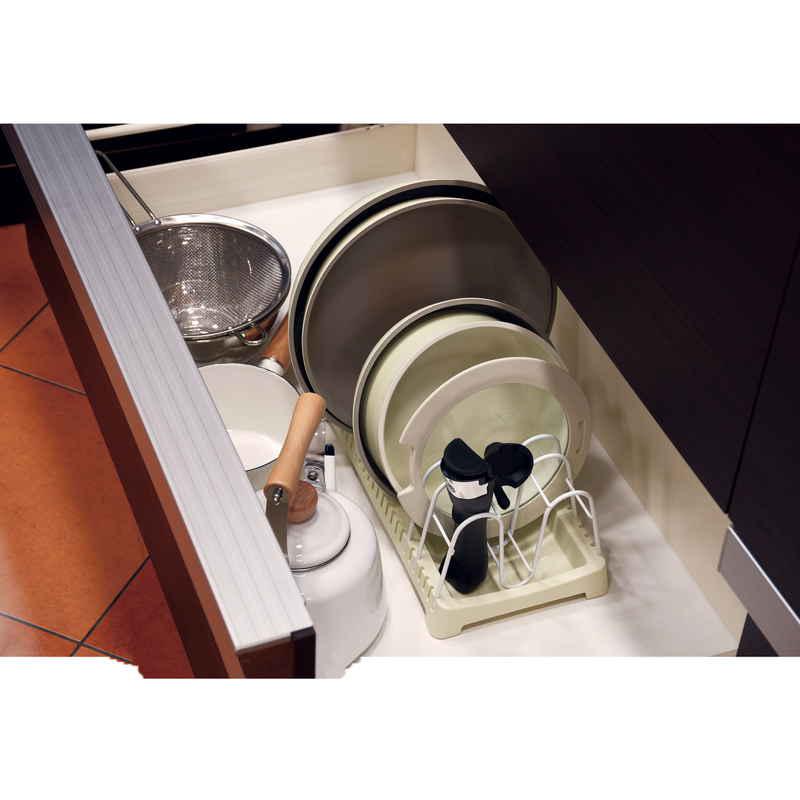 フライパンや鍋のセットをスッキリ収納できる引き出し用収納ラックです。