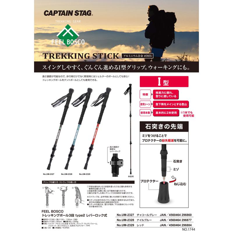 キャプテンスタッグ FEEL BOSCO トレッキングポール 3段 type2 レバーロック式 レッド UM−2329