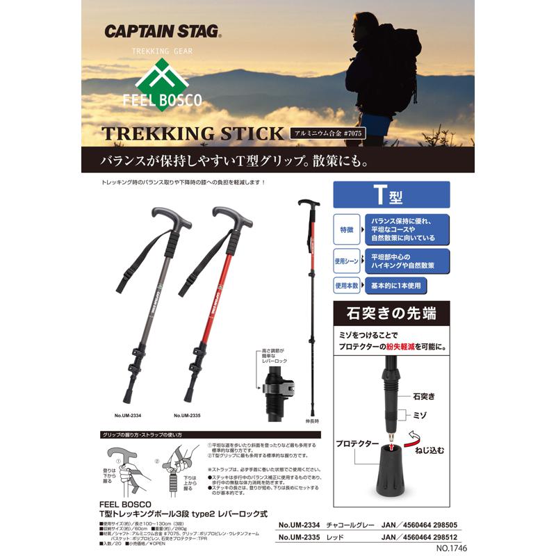 キャプテンスタッグ FEEL BOSCO T型トレッキングポール 3段 type2 レバーロック式 レッド UM−2335