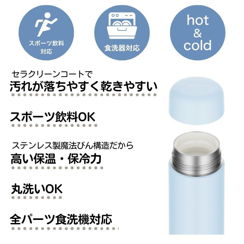■材質:内びん/ステンレス鋼(セラミック塗膜加工)、胴部/ステンレス鋼(アクリル樹脂塗装)、フタ/ポリプロピレン(発泡ポリプロピレン内蔵)、パッキン/シリコーンゴム
