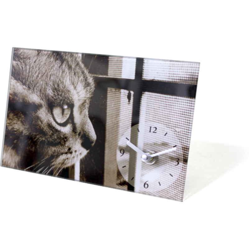 かわいい犬や猫の写真がガラスにプリントされたデスククロックです。