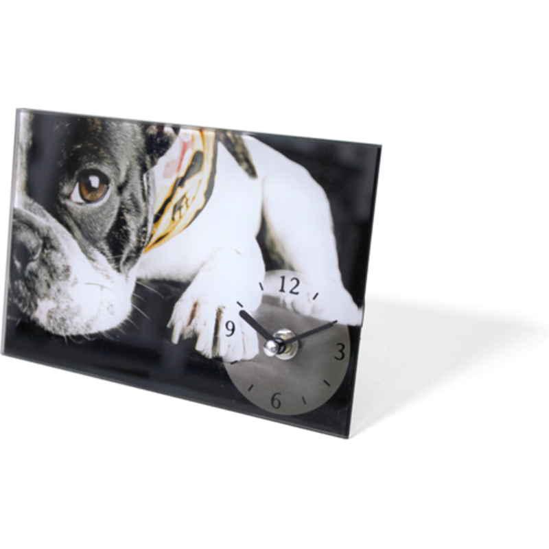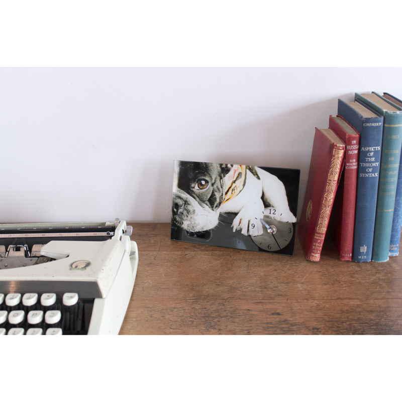 かわいい犬や猫の写真がガラスにプリントされたデスククロックです。