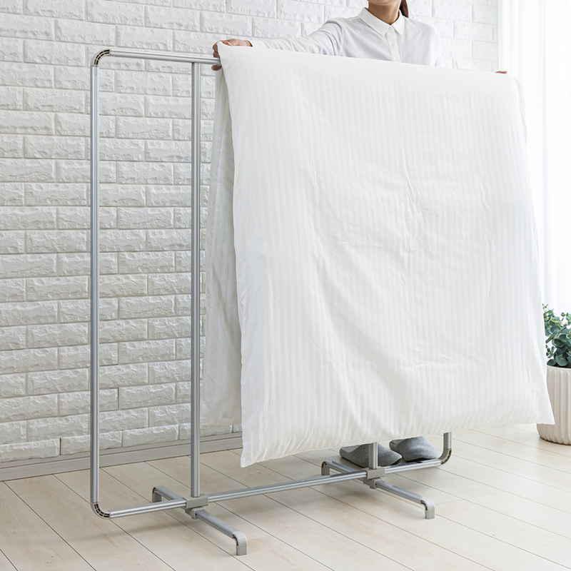 室内での布団干しにも最適、ふとんを持ち上げずに横方向からスライドさせて干せます。