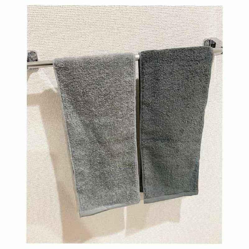 タオルハンガーに2枚掛けられるスリムな幅の半分こタオルです。