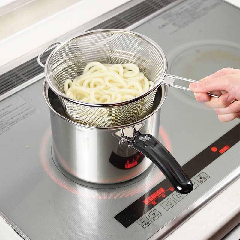 麺類や茹で野菜の湯切りがしやすい手付き深ザル