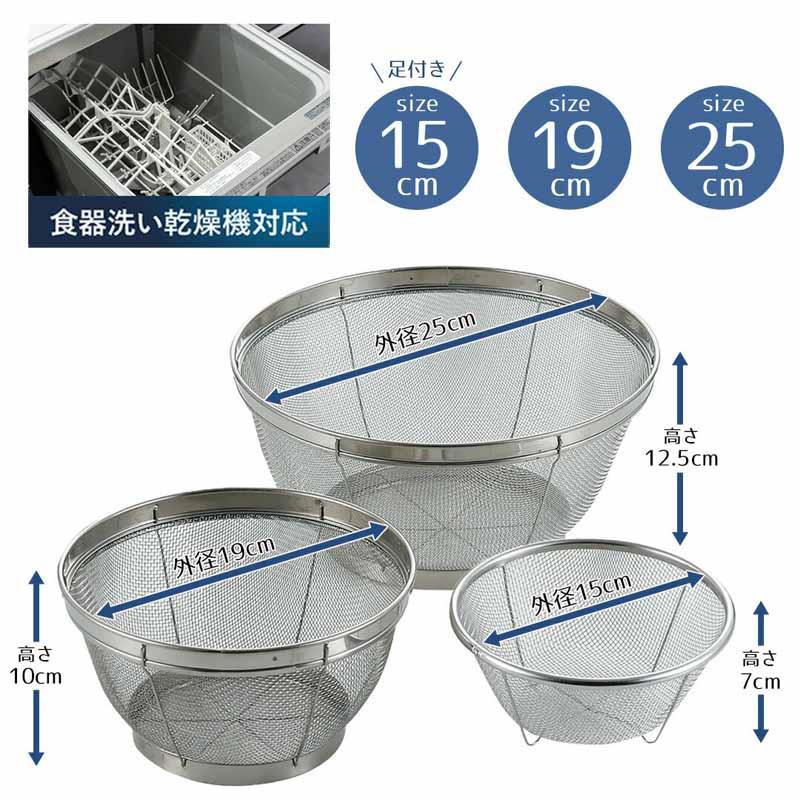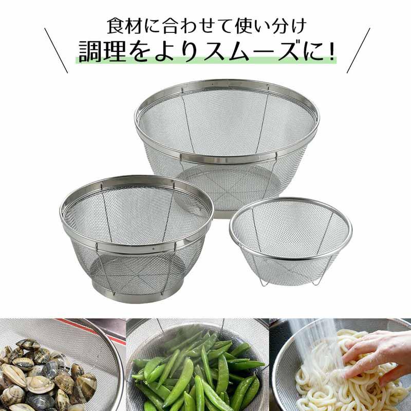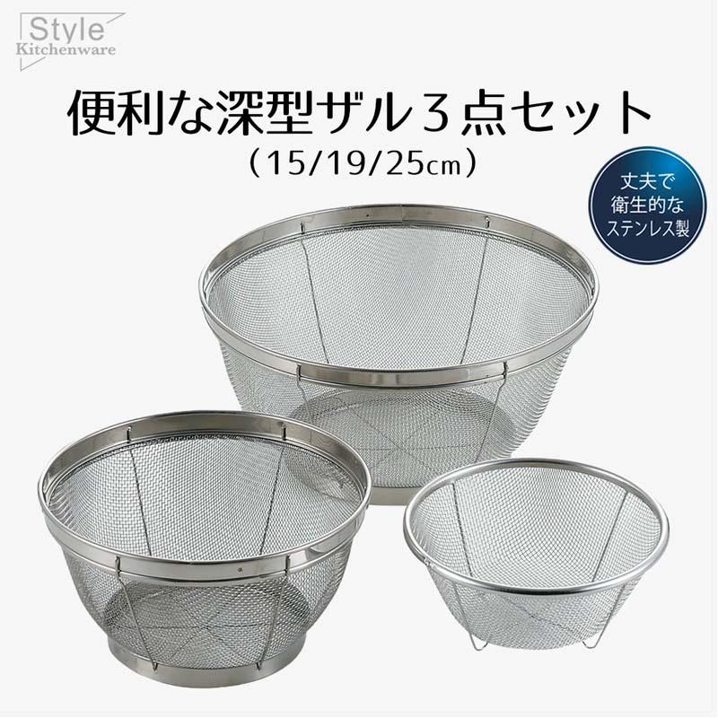 ザル ざる 深型 深型ザル ステンレス セット 3点セット 15cm 19cm 25cm 丈夫 衛生的 食洗機対応 重ねて収納 水切り 麺類 サラダ