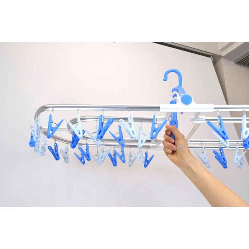 グリップ部分を伸ばせるので、高い位置にある物干し竿に掛けるときもラクにできます。