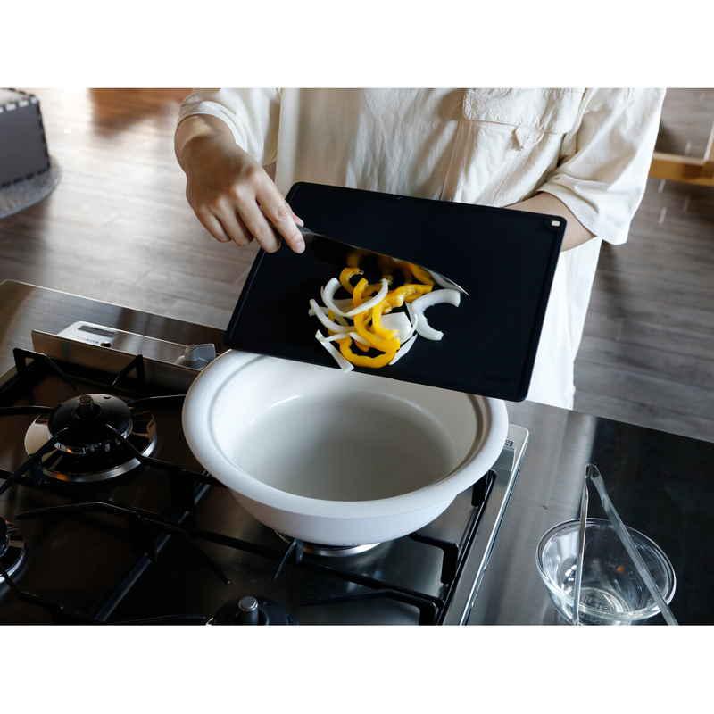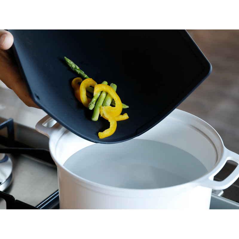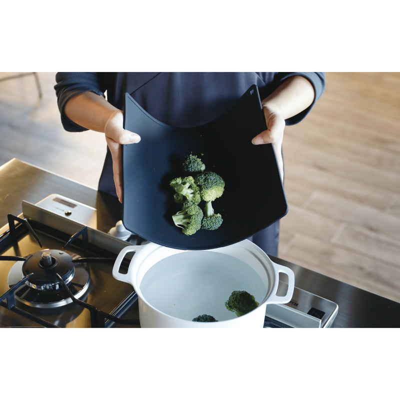 折り曲げられるので、鍋やフライパンに食材を入れやすくなっています。
