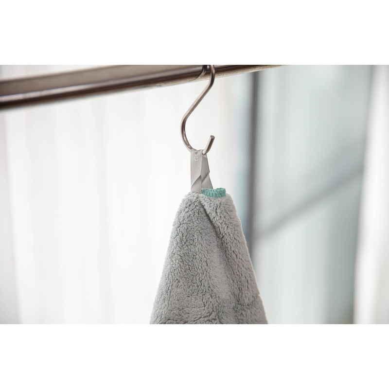 タオルの中央にロゴ入りのリボンが付いているので、フックに掛けられます。