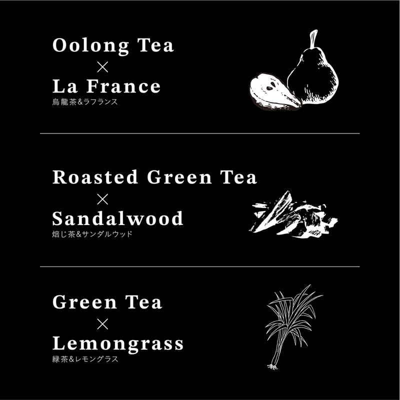 「烏龍茶×ラフランス」「焙じ茶×サンダルウッド」「緑茶×レモングラス」の3種類から、お好きな香りを楽しめます。