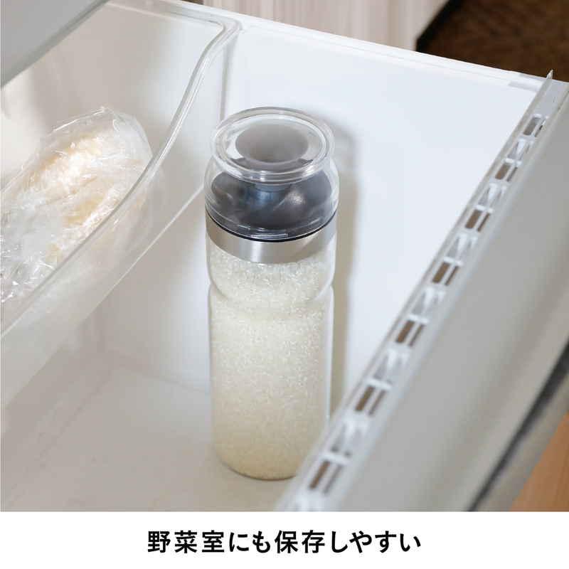 冷蔵庫のドアポケットにすっきり収納できる、ボトル型の米びつです。