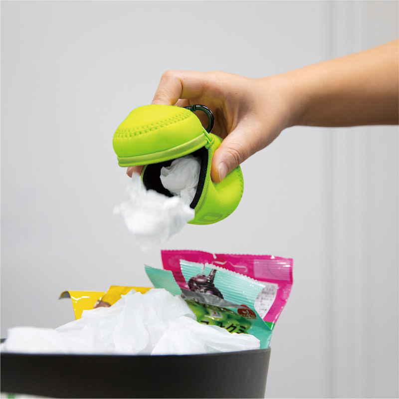 お出かけ先で出るちょっとしたくずゴミの処理に悩まない、カラビナ付きの携帯用ごみ箱です。