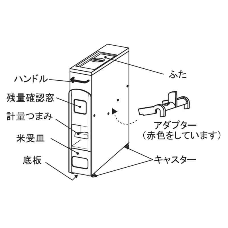 材質:本体/ステンレス鋼板 フタ・残量確認窓/AS樹脂 ハンドル/ABS樹脂 米受皿/ポリスチレン樹脂 キャスター(ローラー部)/ポリアセタール樹脂