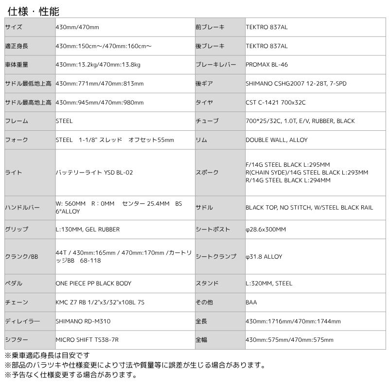・BAA対応、バッテリーライト標準装備、タイヤサイズは700×32C、外装7段変速、前後Vブレーキ、スチールフレーム。