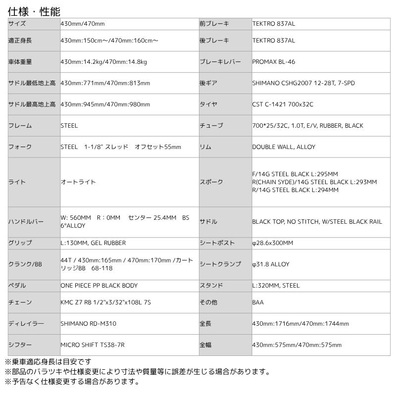 ・BAA対応、タイヤサイズは700×32C、外装7段変速、前後Vブレーキ、スチールフレーム、電池切れの心配が無く明るいLEDオートライトを装備したオートライトモデルです。