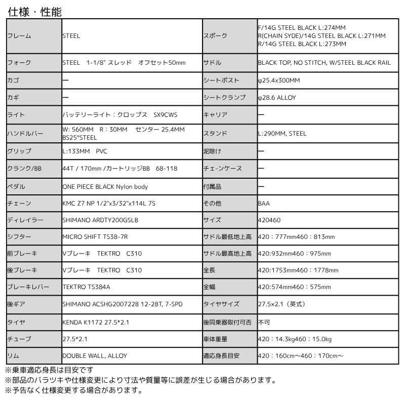 ・基本SPECは、BAA対応、バッテリーライト標準装備、タイヤサイズは27.5×2.1、外装7段変速、前後Vブレーキ、スチールフレームです。