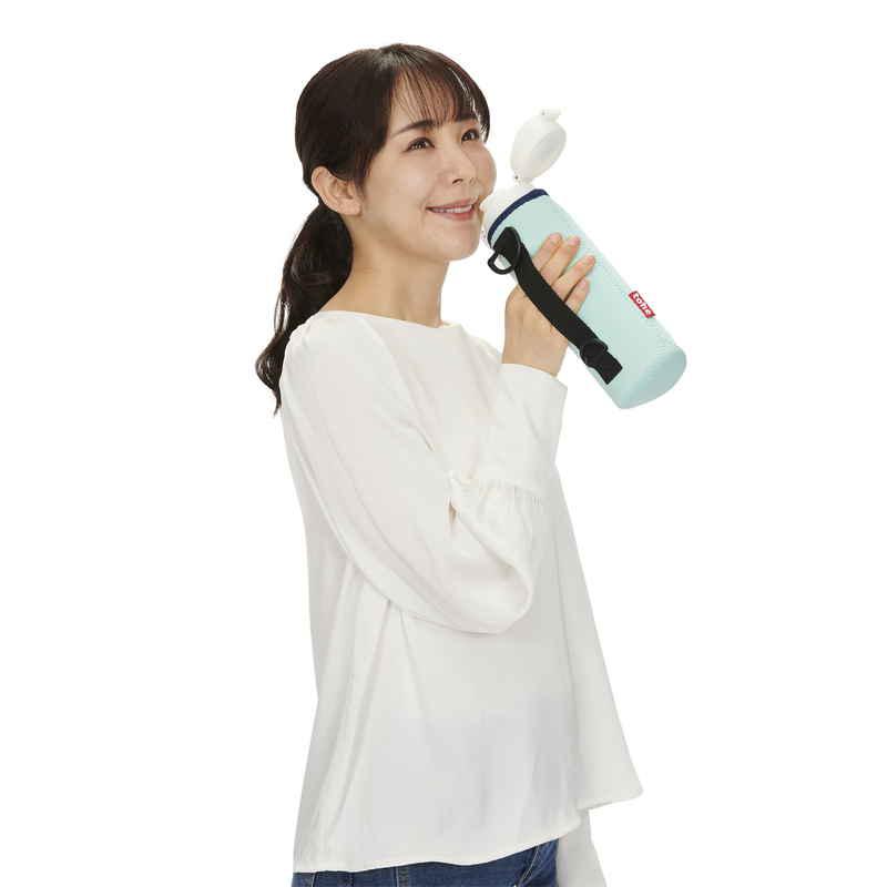 手を差し込めるベルト付きで大きな水筒もラクに飲むことができます。