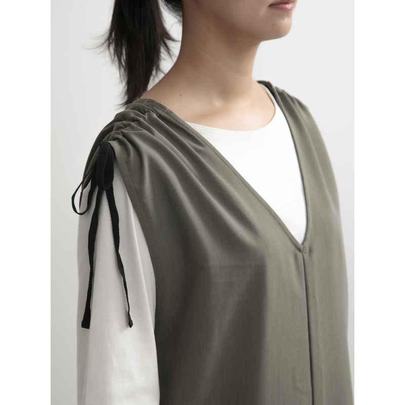 肩にはギャザーが付いており、リボンで肩幅を調整できます。