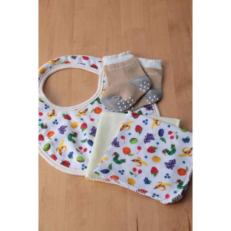 人気絵本「はらぺこあおむし」のデザインが可愛いスタイとハンカチ2枚、ソックスが入ったギフトセットです。