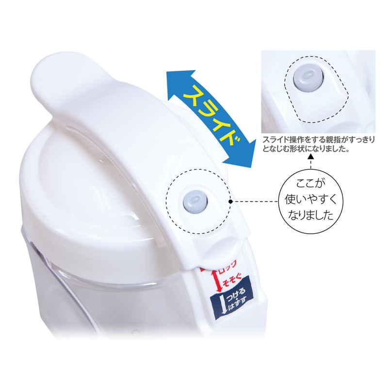 材質:本体/AS樹脂 ハンドル付きフタ/ポリプロピレン スライドキャップ/ABS樹脂 バネ/ステンレススチール パッキン・注ぎ口用パッキン/シリコーン