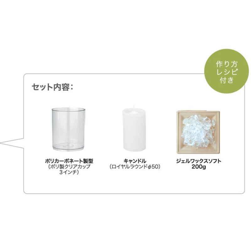 セット内容:1個 【セット内容】ジェルワックス200g(ジェルワックスソフトタイプ200g)、キャンドル(ロイヤルラウンド直径50 ホワイト)、ポリカーボネート型(ポリ製クリアカップ3インチ)各1個、作り方説明書