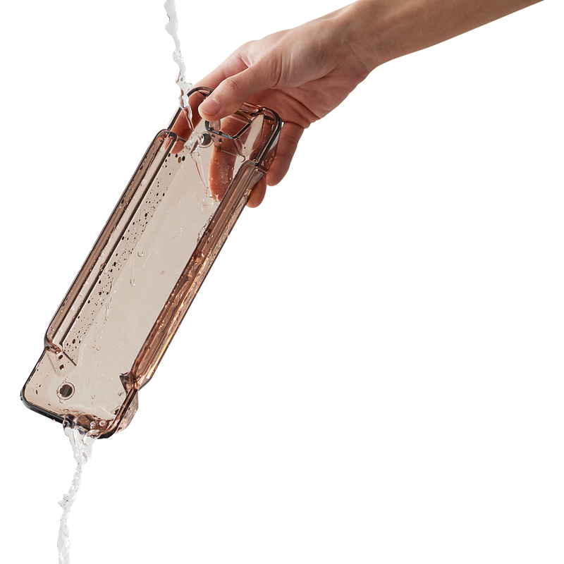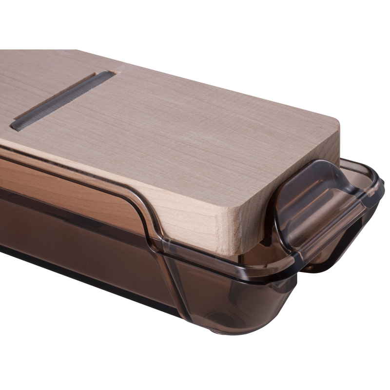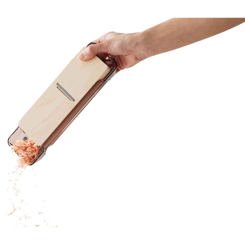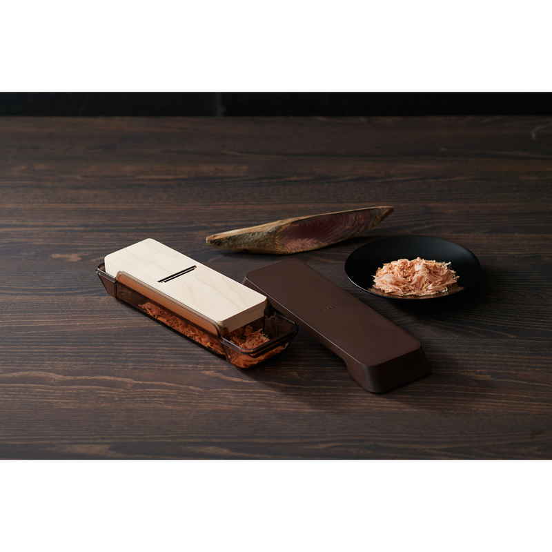 削り具合がひと目で分かる受け皿で使いやすい 透き通った受け皿で削り具合がすぐ分かる 滑り止め付きで安心・安全 カンナを外さずに鰹ぶしを取り出せる 一体成形で洗いやすい