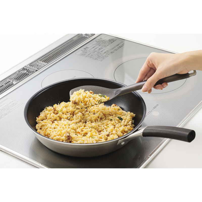 フライパンで炒めて、そのまますくって盛り付けまでできるスプーンヘラです。