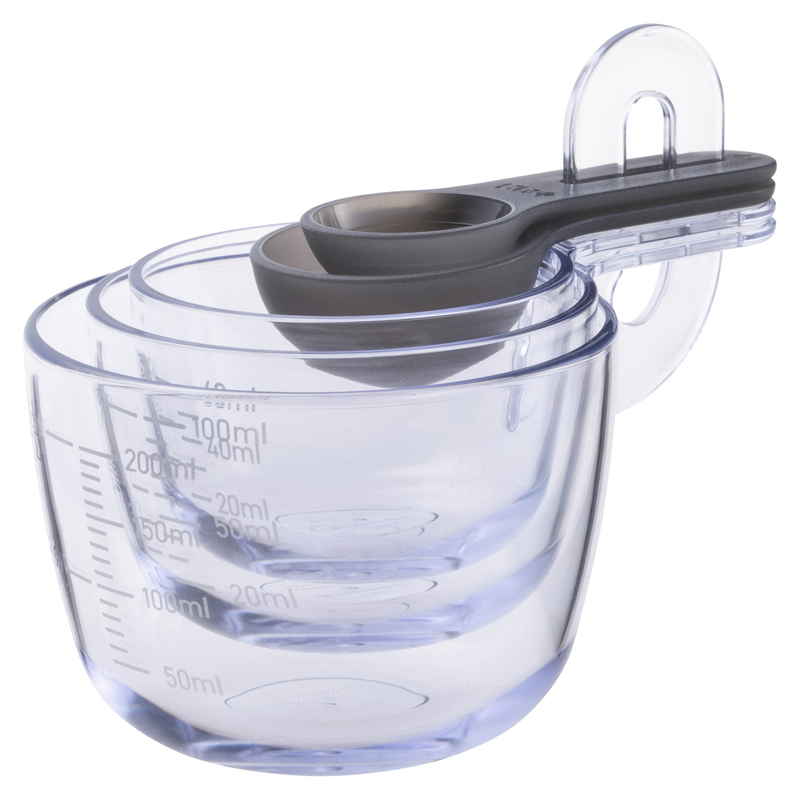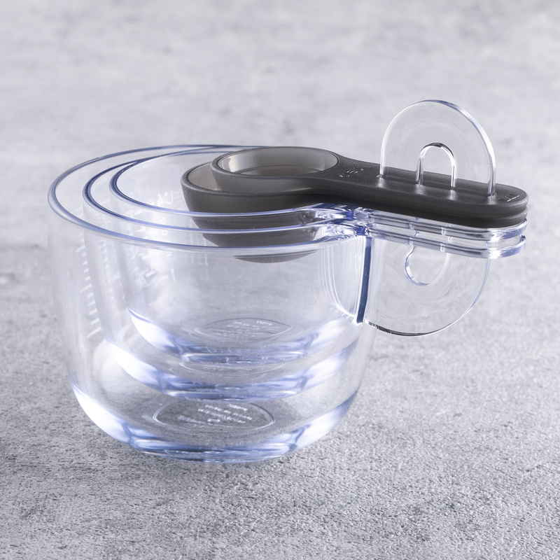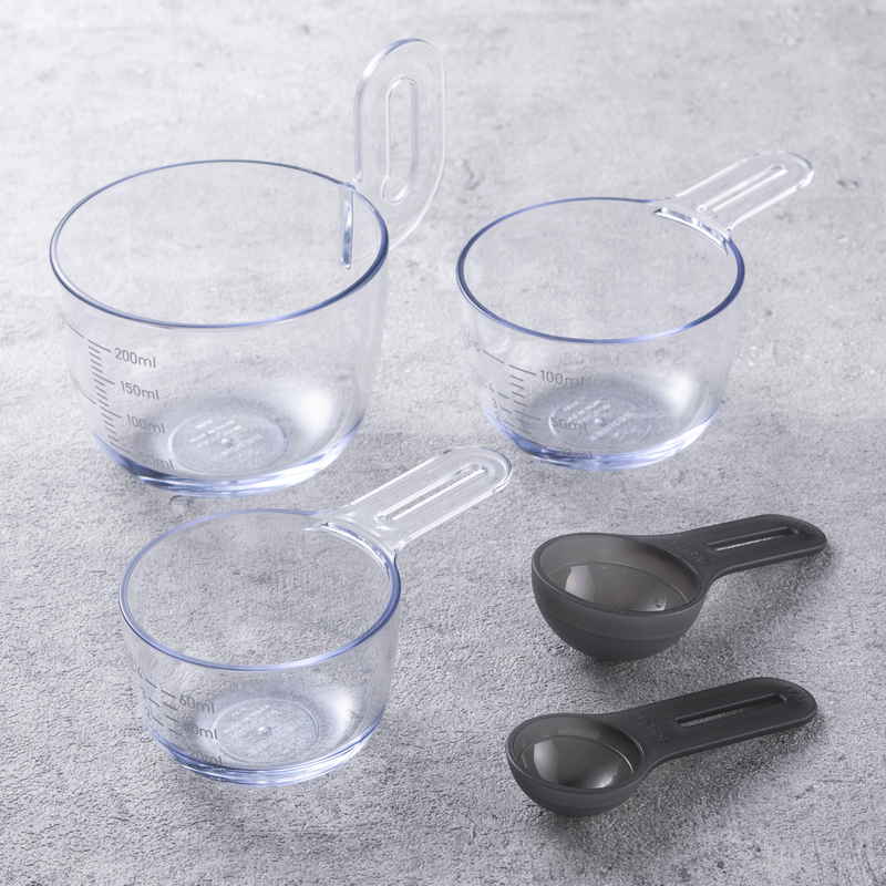 重ねてコンパクトに収納できる大さじ1、小さじ1の計量スプーンと、60ml、100ml、200mlの計量カップのセットです。