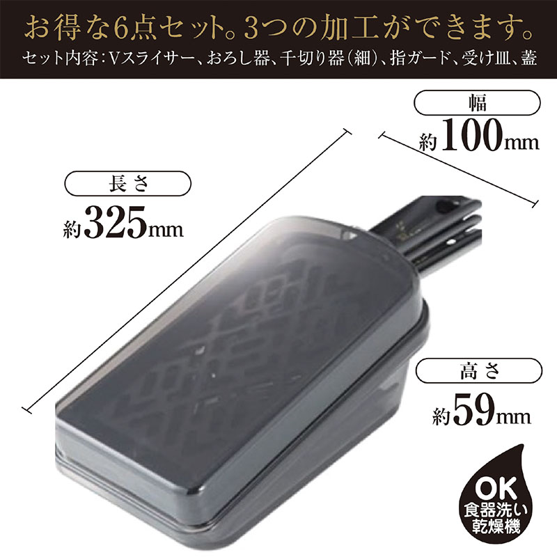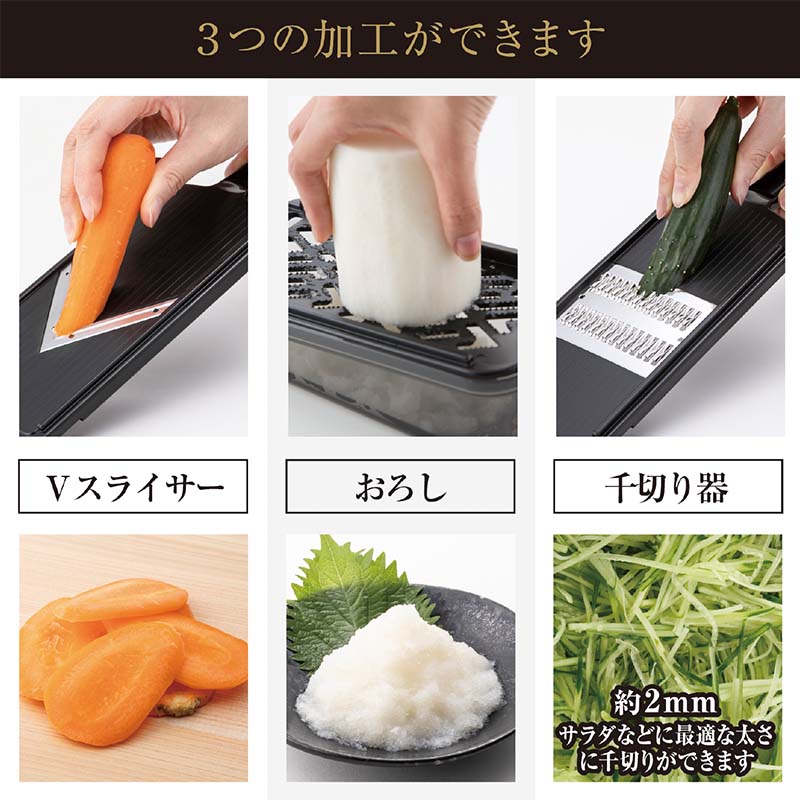 1台で「おろし・スライス・2mmの千切り」ができる調理器セットです。