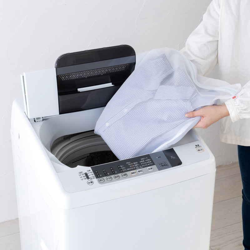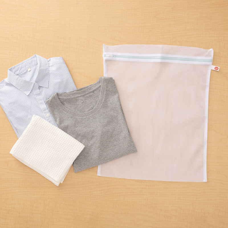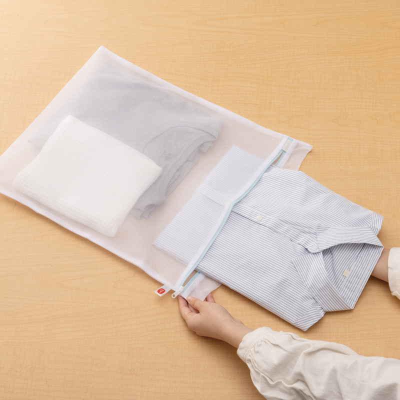 角型の洗濯ネットで、たたんだ状態でネットに入れた衣類がフィットして型崩れを防ぎます。
