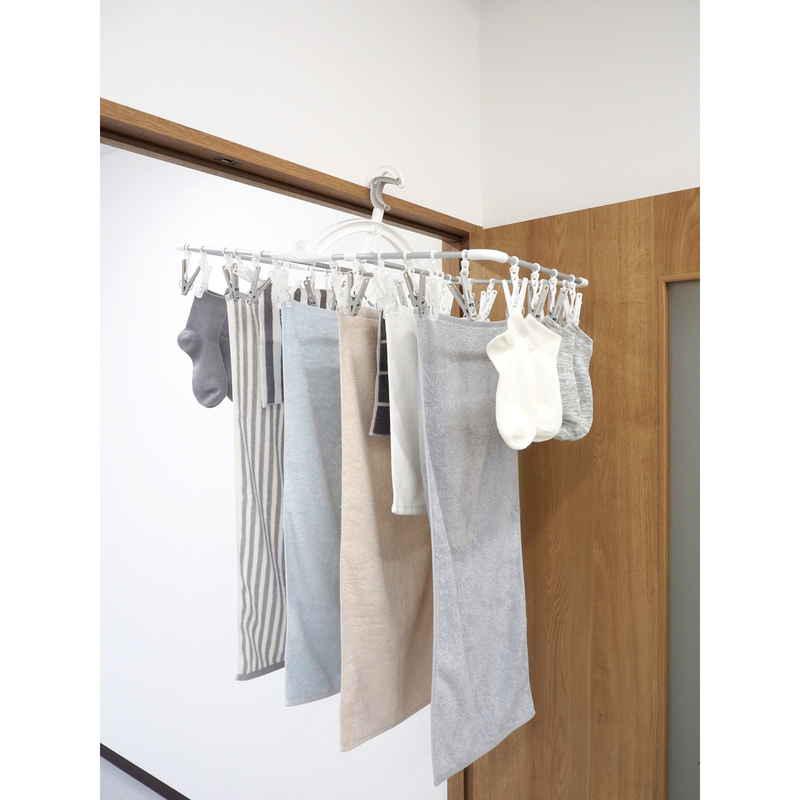 グリップ部の丸穴に別の小型ハンガーを掛けて、スペースの有効活用ができます。