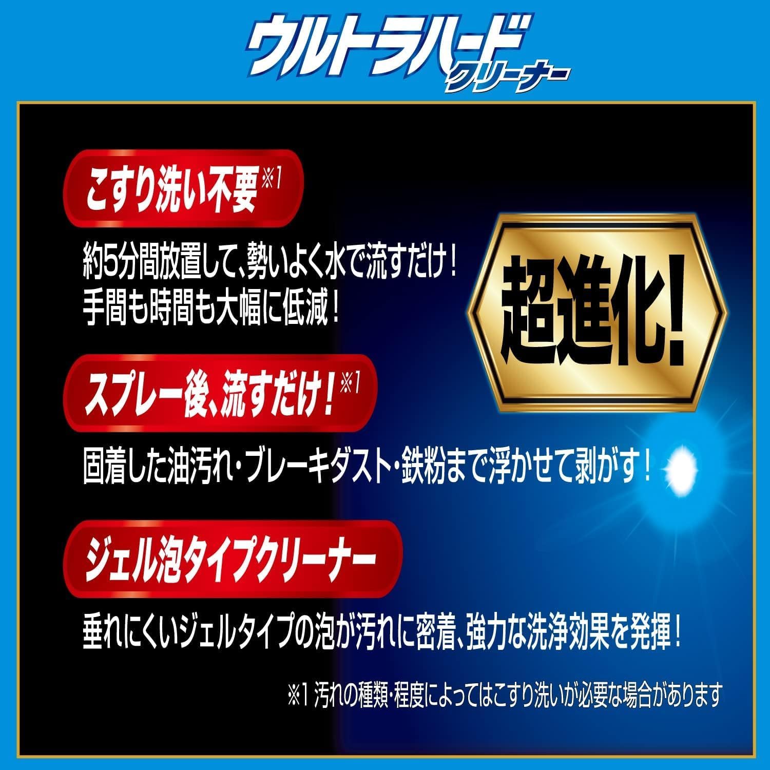 ウルトラハードクリーナーは、頑固なブレーキダストや道路汚れを瞬時に分解し、ホイールとタイヤを新品同様の輝きに戻します。洗浄力が高いため、手間をかけずに短時間で効果を実感できます