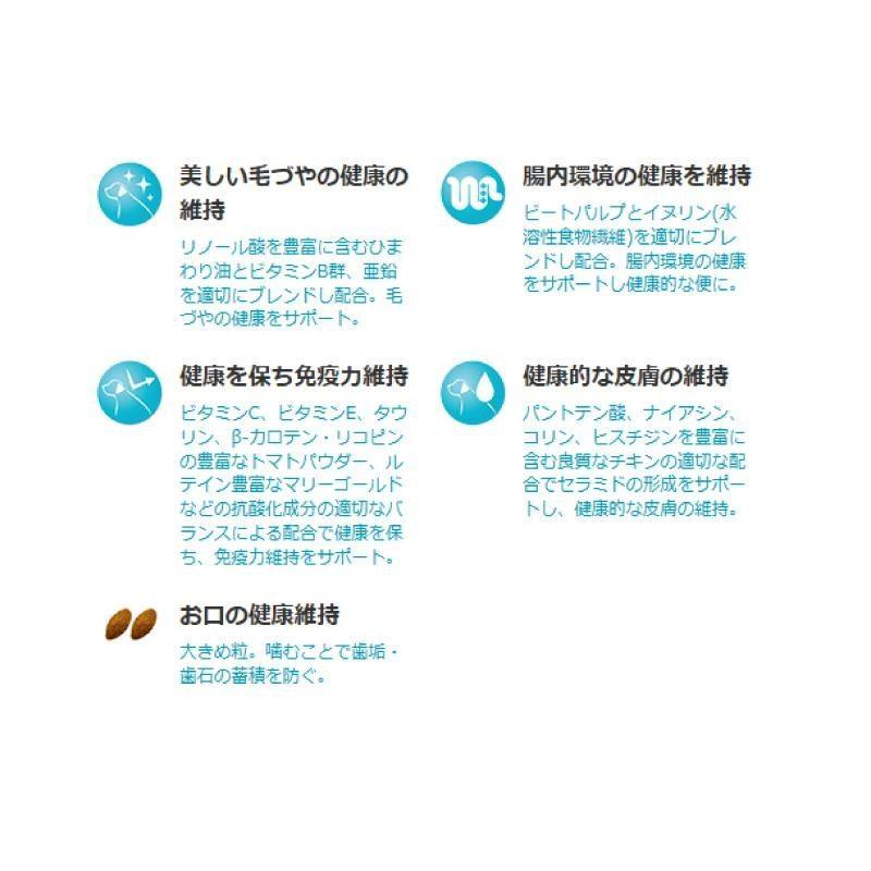 米、チキンミール、とうもろこし、さとうもろこし、コーングルテン、チキンエキス、鶏脂、シュガービートパルプ、家禽類、ひまわり油、イヌリン、トマトパウダー、マリーゴールド、緑イ貝粉末、STPP (トリポリリン酸塩)、ビタミン類(A、B1、B2、B6、B12、C、D3、E、コリン、ナイアシン、パントテン酸、葉酸)、ミネラル類(亜鉛、カリウム、カルシウム、クロライド、セレン、鉄、銅、ナトリウム、ヨウ素、リン)、アミノ酸類(アルギニン、タウリン)、酸化防止剤(BHA、BHT、クエン酸、ミックストコフェロール、ローズマリー抽出物)