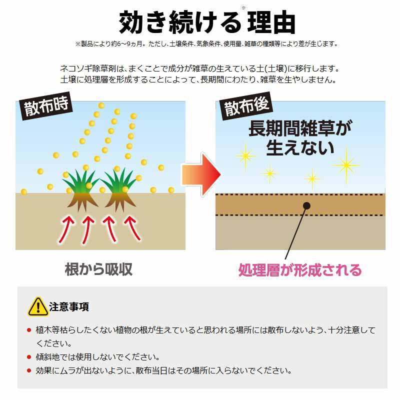 ・成分が土壌に一定期間とどまるので、新しい雑草の発生を予防できます。この効果は約5〜9ヶ月間持続します(散布した時期や散布量によって差が生じます)
