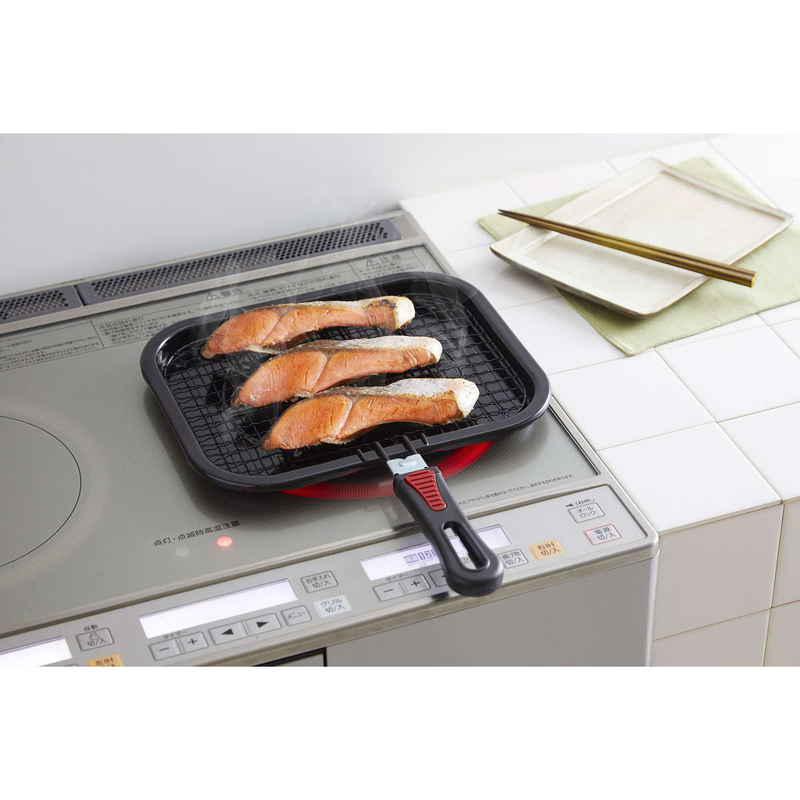 材質:受皿/鋼板(ホーロー加工) 焼アミ/鉄線(フッ素樹脂加工) 取手/フェノール樹脂 金具/ユニクロメッキ