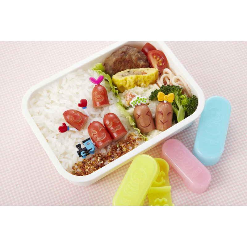 ウインナー用の抜き型と、アレンジピックのセット♪ 抜き型は全部で6種類の顔がつけられるよ! アレンジピックは「バンザイ」「りぼん」「汽車ごっこ」「クローバーかんむり」「ハート」の5種類で、とってもユニーク♪ ウインナーが型から外れにくい時に便利な押し出しピック付き! 電子レンジ、オーブン、食器乾燥機、食器洗い乾燥機等、冷凍庫は使用不可。