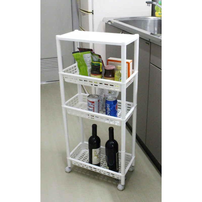 散らかる小物やストック類などをすっきりと整頓できる、樹脂製の4段ワゴンです。