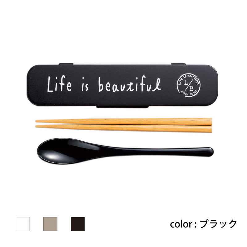 正和 コンビセット 箸 スプーン 18cm LIFE IS BEAUTIFUL スタンプ ブラック