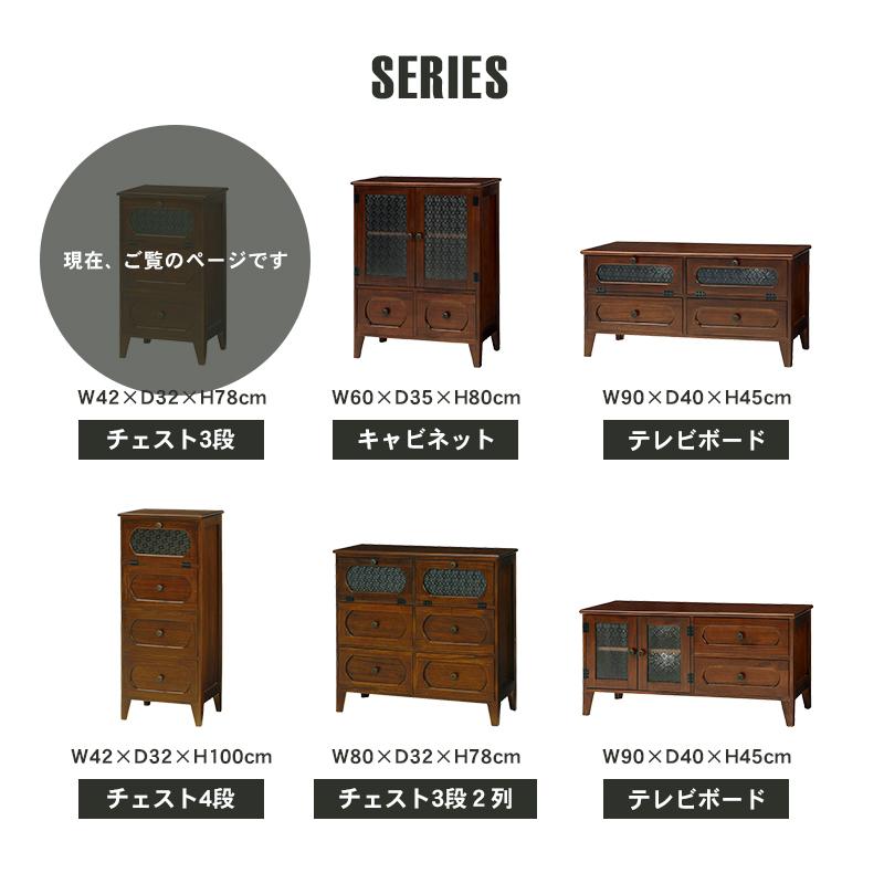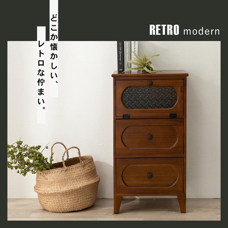 萩原 チェスト MCH-5183BR ブラウン 3段 収納 フラップ扉 アンティーク調 モザイクガラス