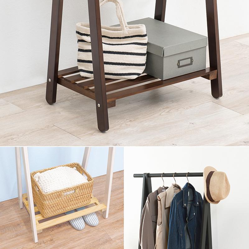天然木の風合いがおしゃれな棚付きハンガーラック
